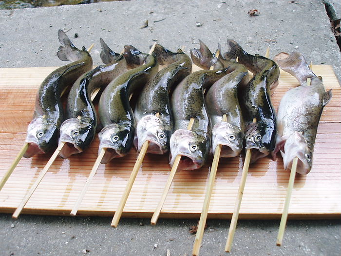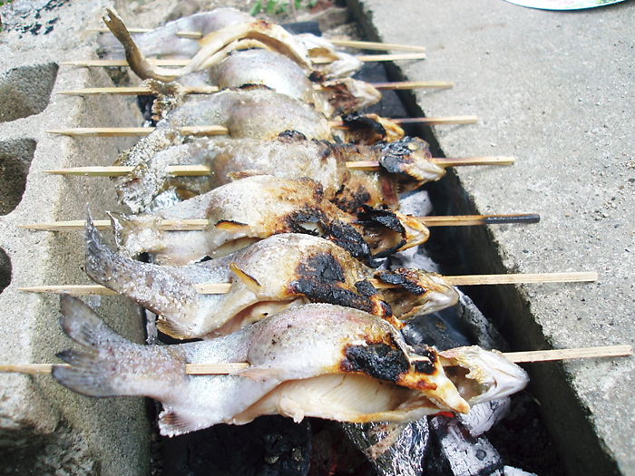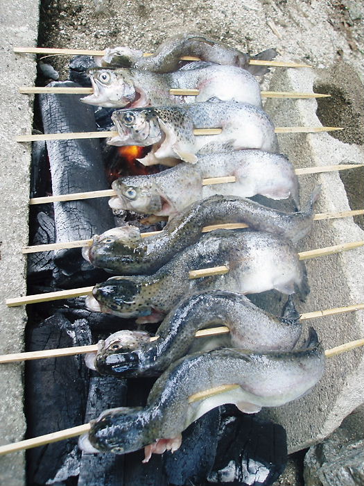30分もすれば、“パチパチ ジュージュー”と音を立てて焼けてきます。ニジマスの焼いた香りが煙とともに立ち込めると、お腹が“グーグー”と共鳴現象…