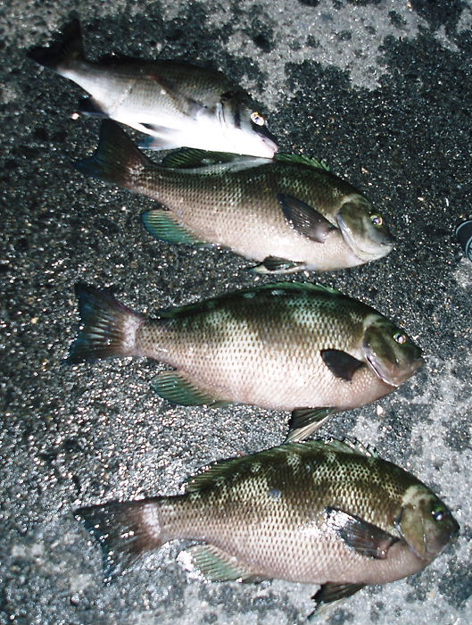 夜釣りをするのだが、足元で一ヒロ。はじめはフグの猛攻で餌がグレの所に届かない様子。